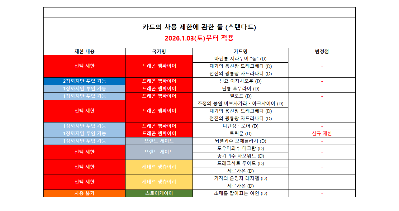 ※ 아래의 리스트에 없을 경우, 해당 카드는 규제되지 않은 카드입니다.